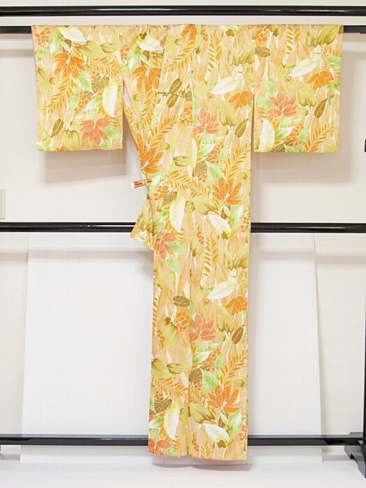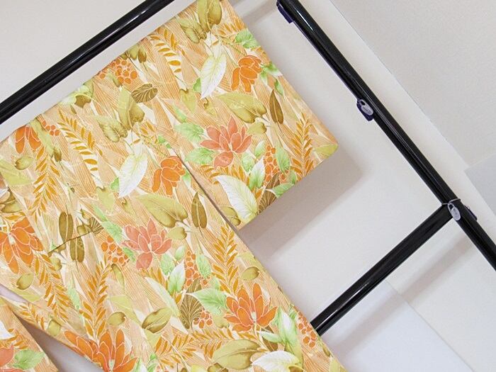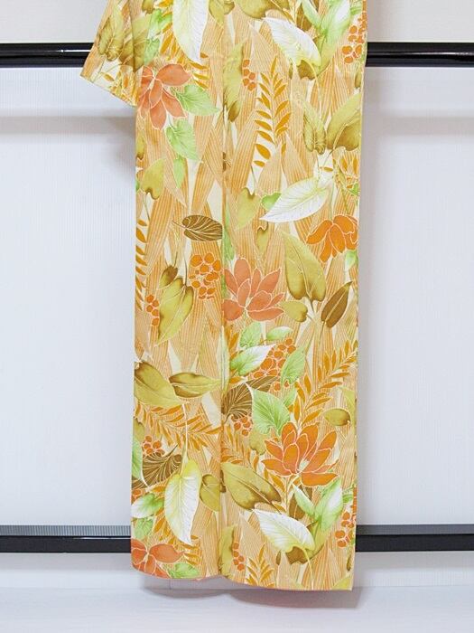【美品】洗えるお着物です。オレンジ系の洋花柄の小紋袷
