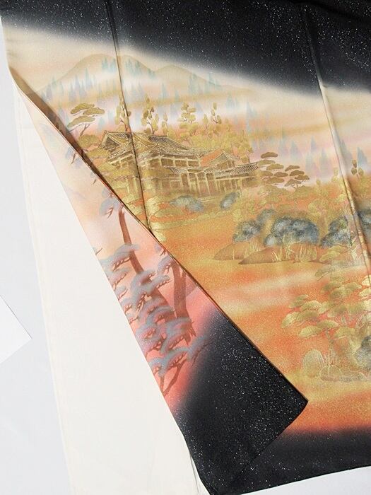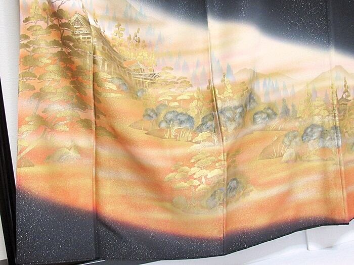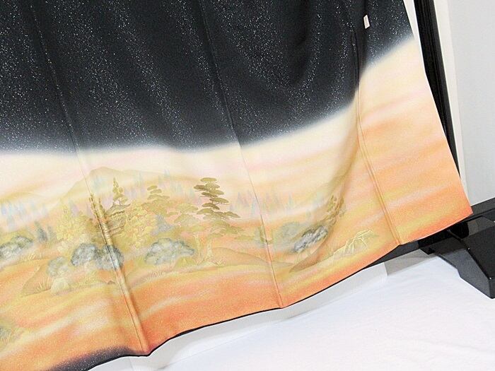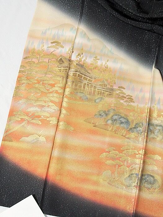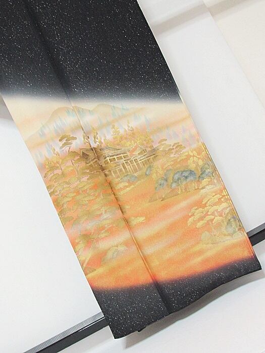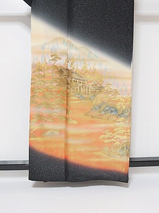 【色留袖】正絹/正絹比翼付き/5つ紋/黒 金通し生地/落款入り/京洛景/黒 オレンジ☆156cm前後の方ベスト【美品】