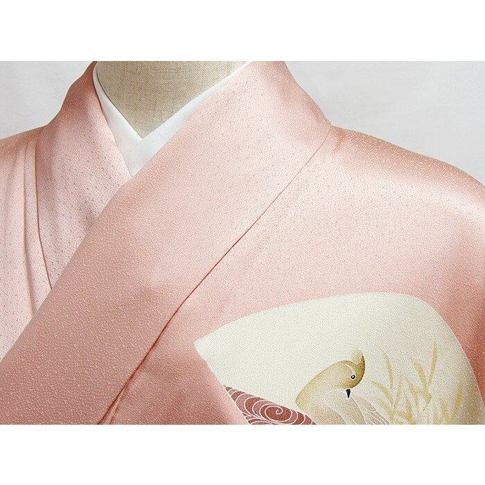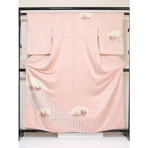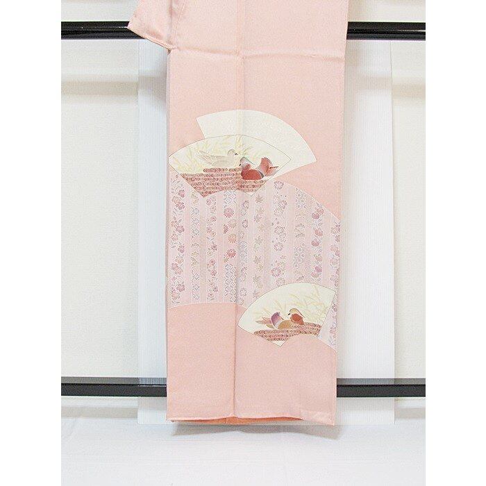 【附下げ 袷着物】一つ紋入り(檜扇)/紋綸子/刺繍入り 地紙にオシドリ/ピンク★159cm前後ベスト【美品】
