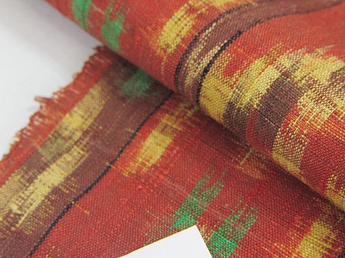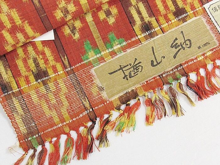 ☆伝統工芸【紬 楢山紬】 上質 真綿紬/花菱☆朱赤地に黄/緑他