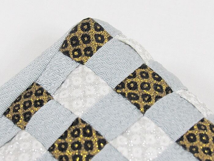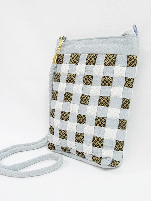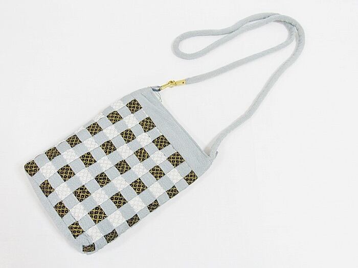 【新品 アウトレット】ポリちりめん 和柄 市松(網代あみ) ショルダー バック☆グレー/黒金・白銀