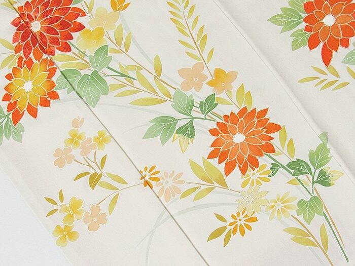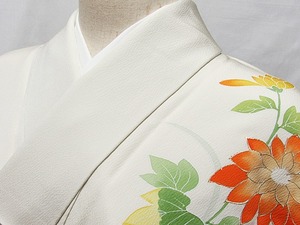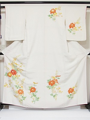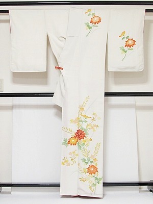 【未使用 仕付け】附下げ 袷着物 一越 菊 刺繍/164cm前後ベスト★灰白(白)【美品】お薦めです
