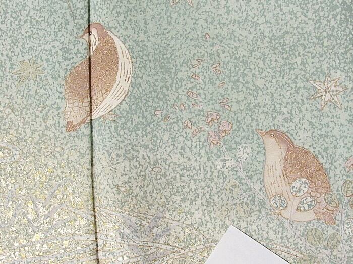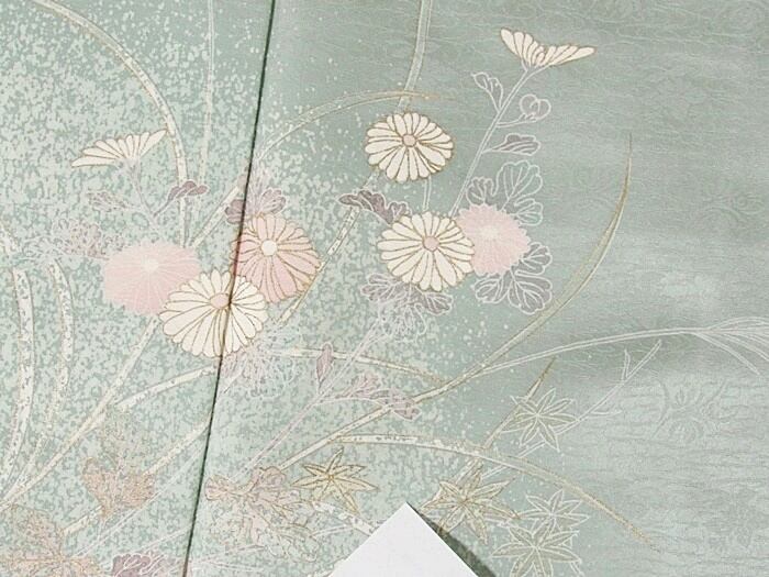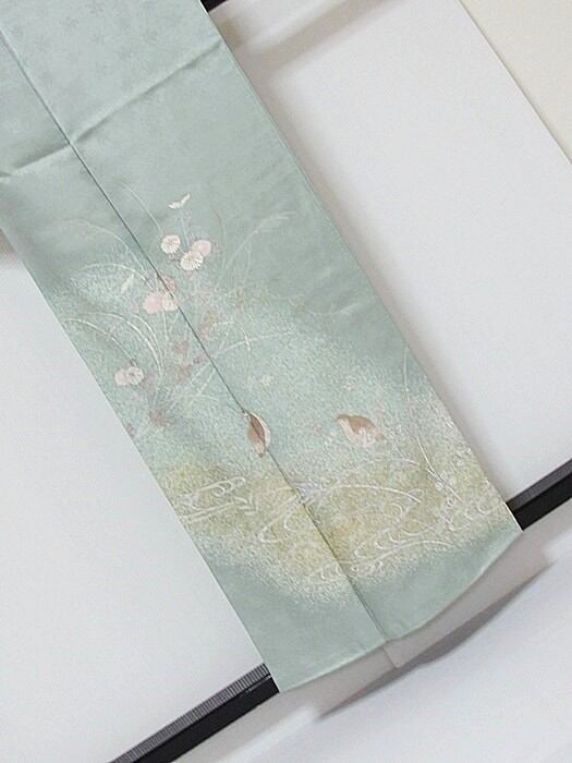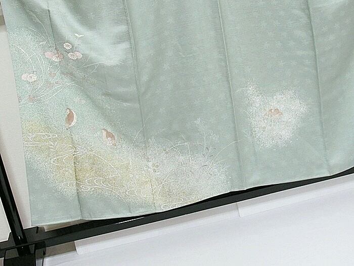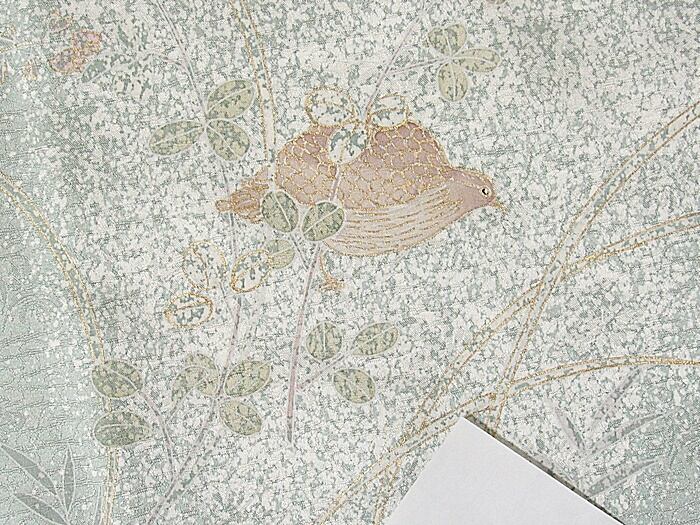 地色は淡い さびせいじ色で秋草花文様に鶉(ウズラ)が描かれております。お着物の状態も良くすぐに着用できます。お出掛け、お習い事…などから準フォーマルなお席まで巾広くご使用下さいませ。生地のダメージはございませんが下記確認の上ご検討くださいませ。