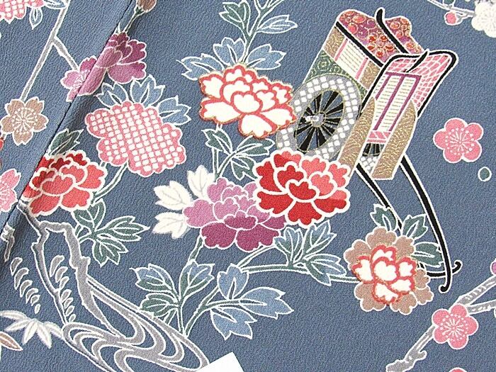 【小紋】袷着物 縮緬/霞に御所車 牡丹 梅 菊他/藍グレー☆157cm前後ベスト【美品】