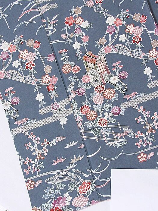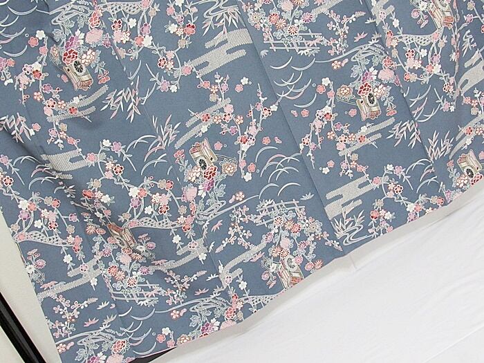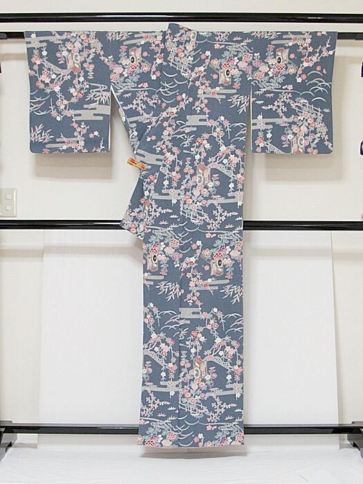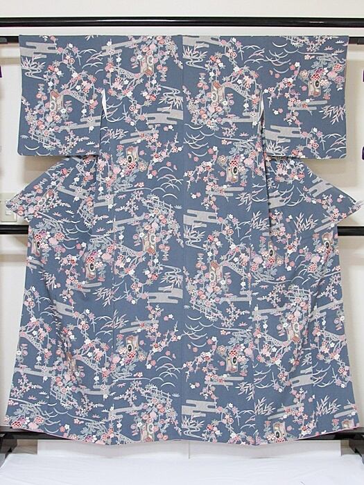 小紋 袷 縮緬 霞 御所車 牡丹 梅 菊 藍グレー 157cm