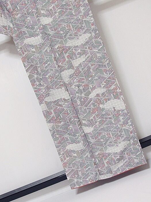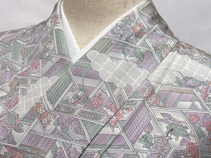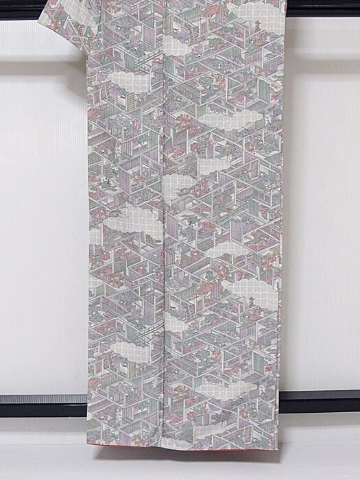 【小紋】 袷着物 色紙雲に御所絵図/グレーイッシュパープル☆158cm前後ベスト【美品】