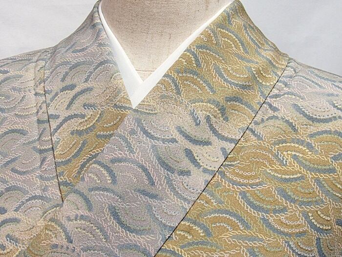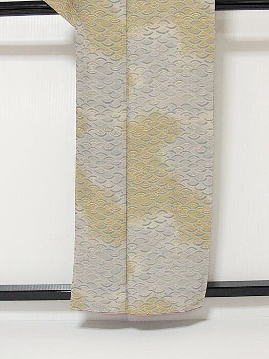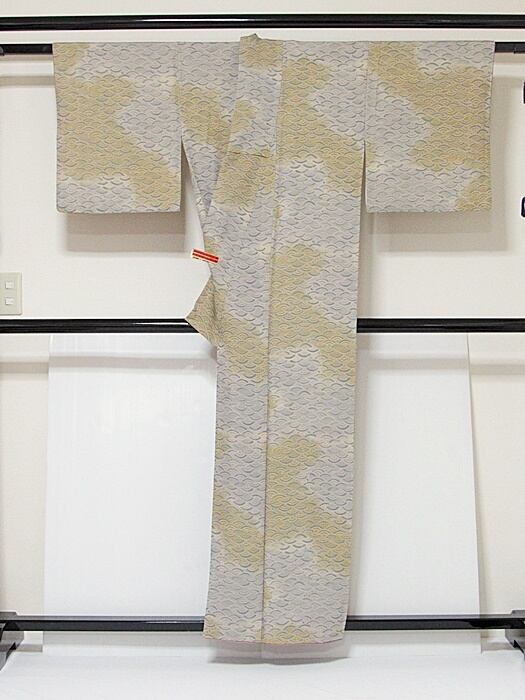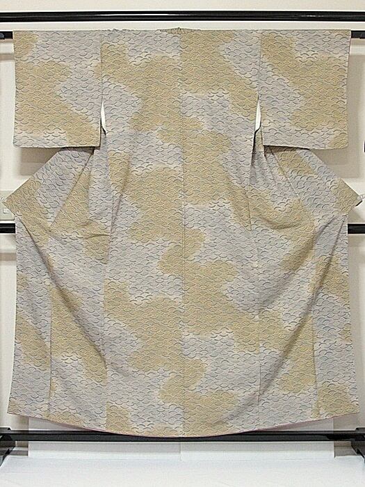 【小紋】袷着物 綸子 縄編み青海波/グレー 黄土色☆154cm前後ベスト【超美品】お薦めです