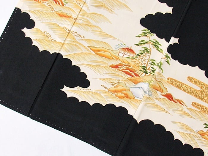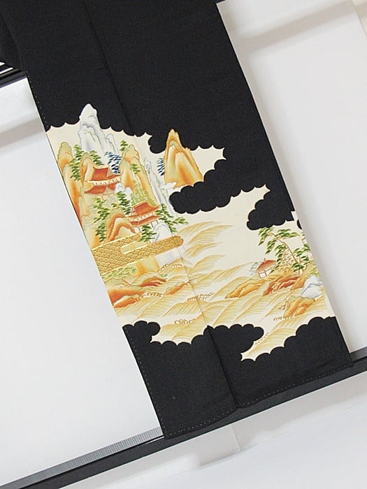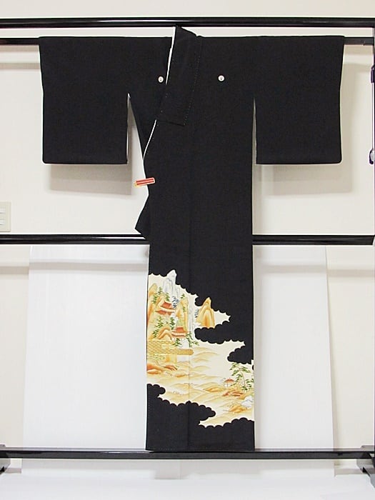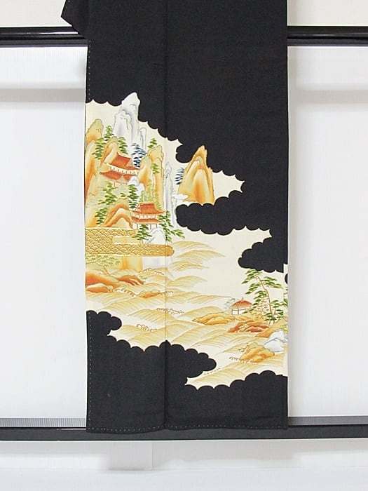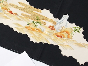 【黒留袖】正絹 比翼 一越 刺繍 裏雲取り蓬莱山☆151cm前後の方ベストサイズ