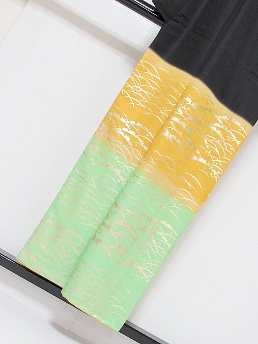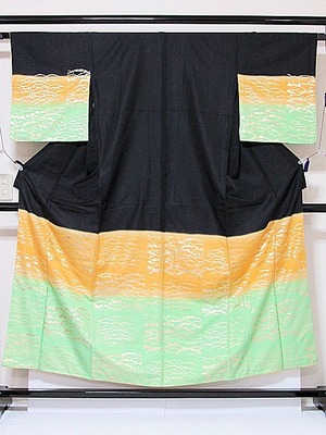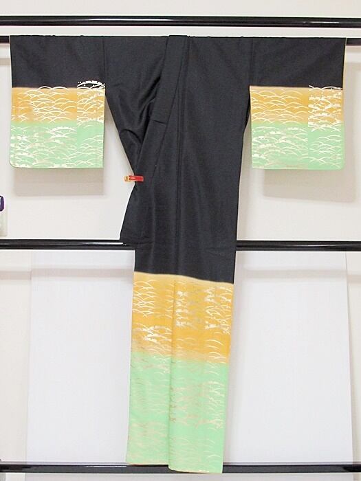 洗えるキモノ【附下げ】単衣 八掛付き 金露芝 黒☆154cm前後ベスト/踊り 舞台 ステージ イベント