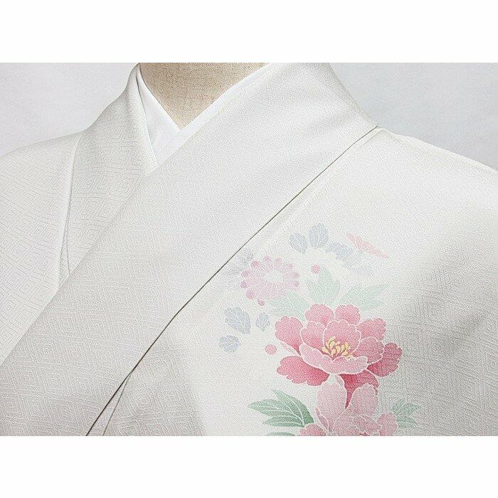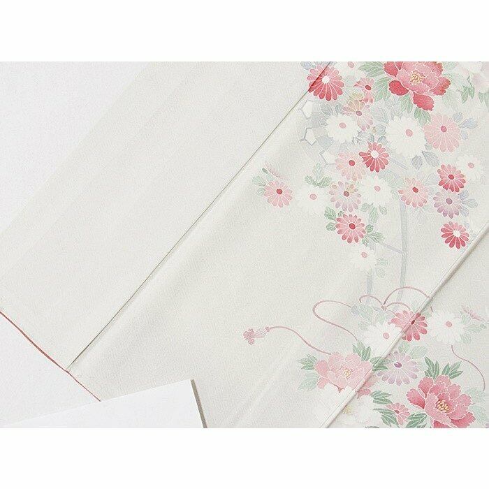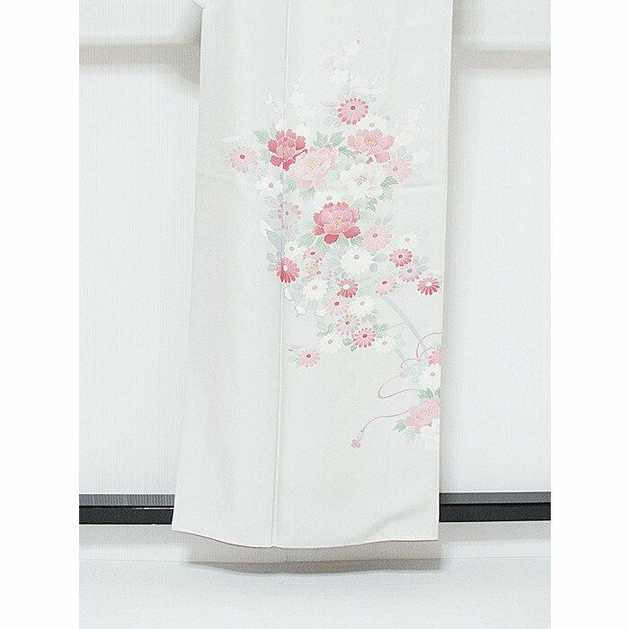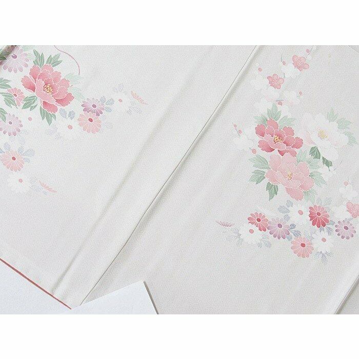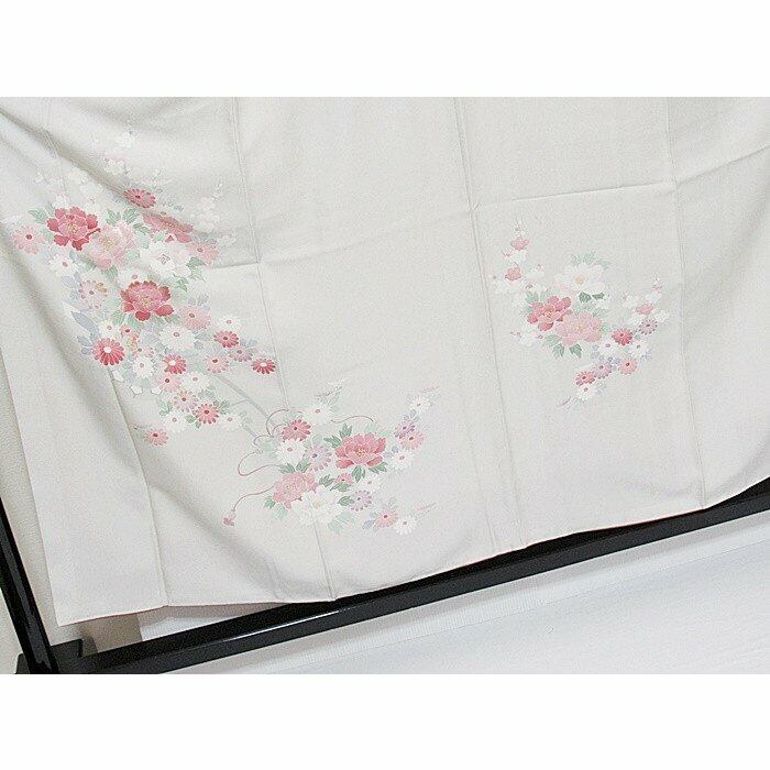 附下げ 袷着物 紋綸子 刺繍 花車 牡丹 梅 156cm 灰白