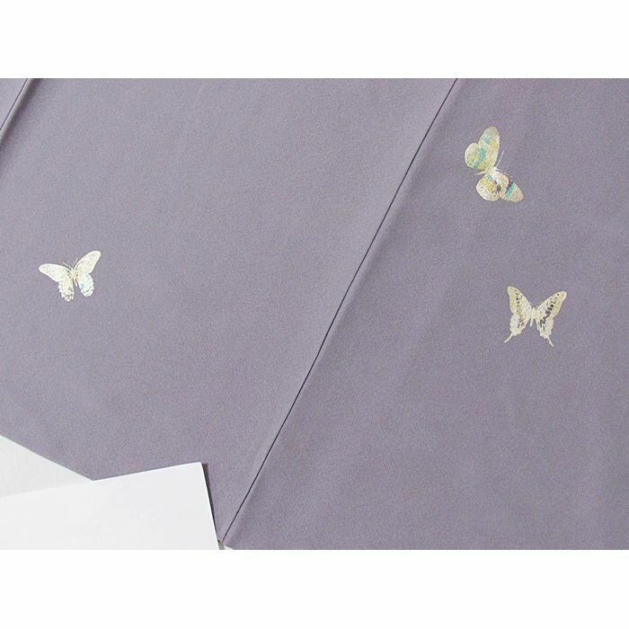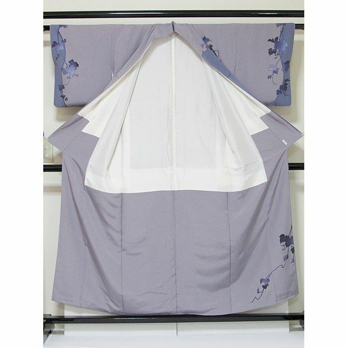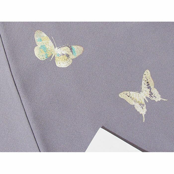 附下げ 袷 綸子 金銀箔 ブドウ 蝶 153cm グレイッシュラベンダー