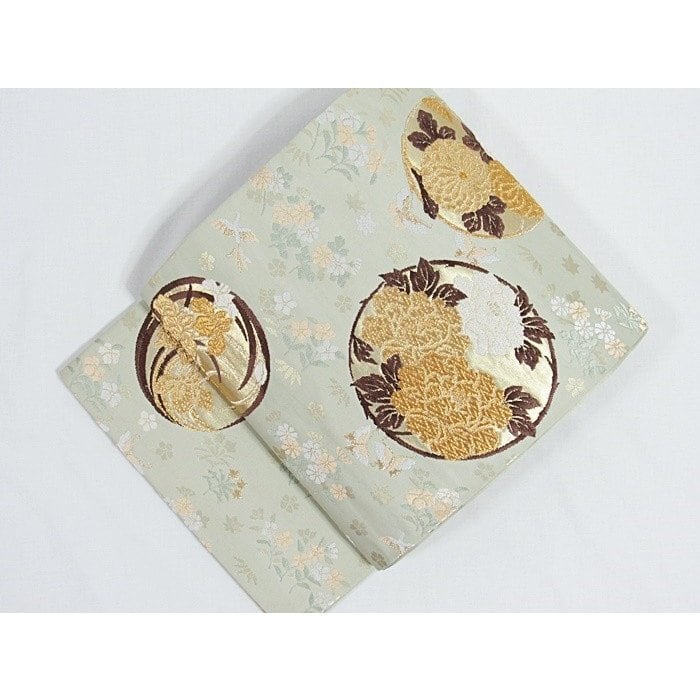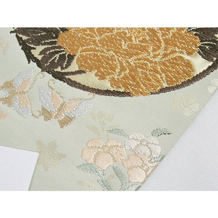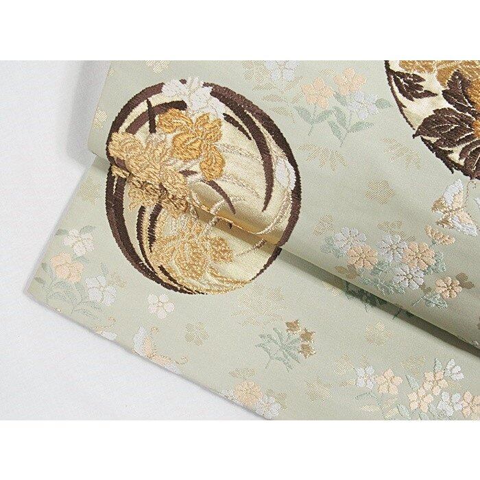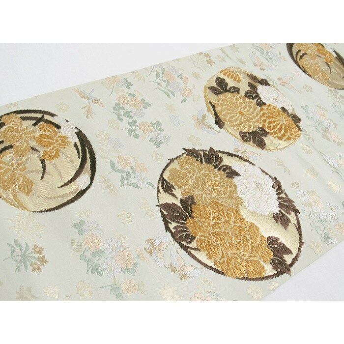 錦 袋帯 正絹 牡丹菊杜若文 ペールグリーン