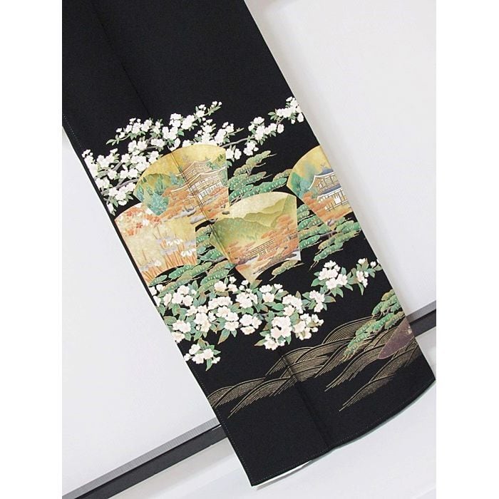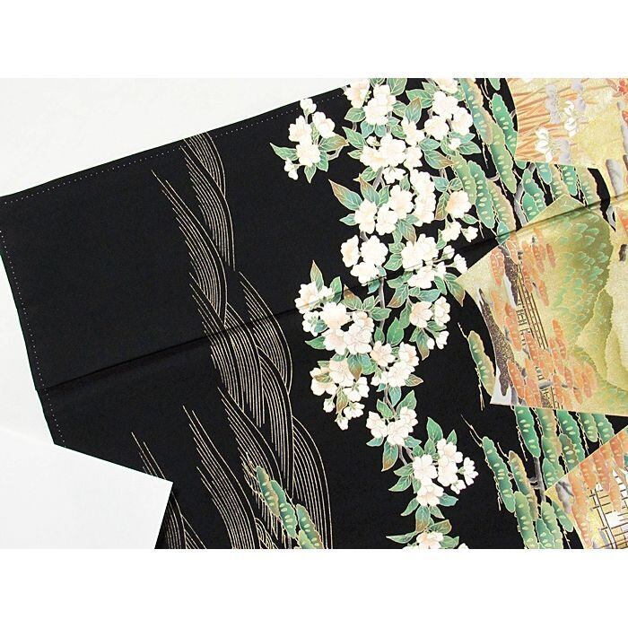 黒留袖 正絹一越 比翼 枝桜 地紙 波 松 鶴 163cm前後