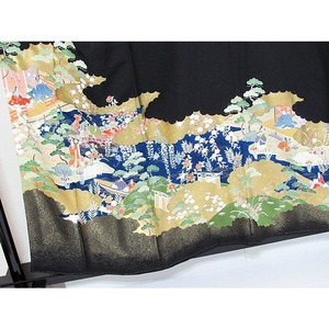 黒留袖 正絹一越 比翼(化繊) 落款 寿光 裏雲に時代絵図 153cm前後ベストサイズ 美品