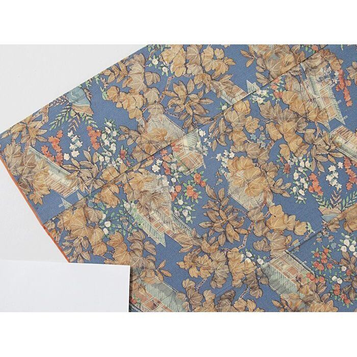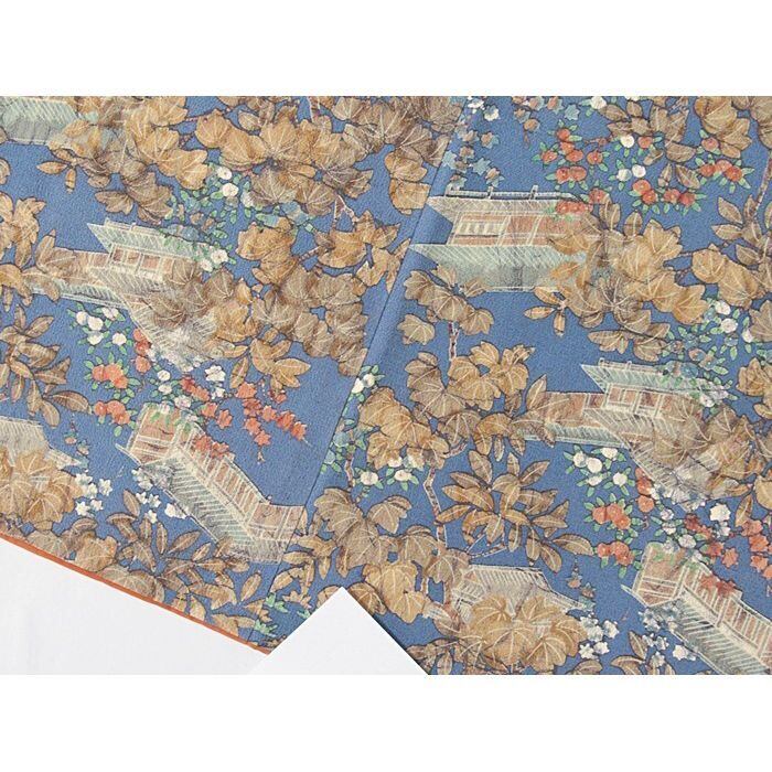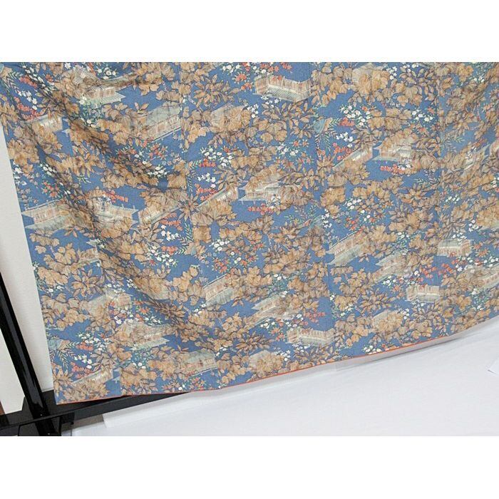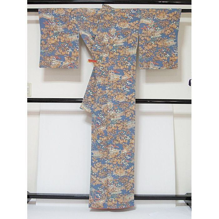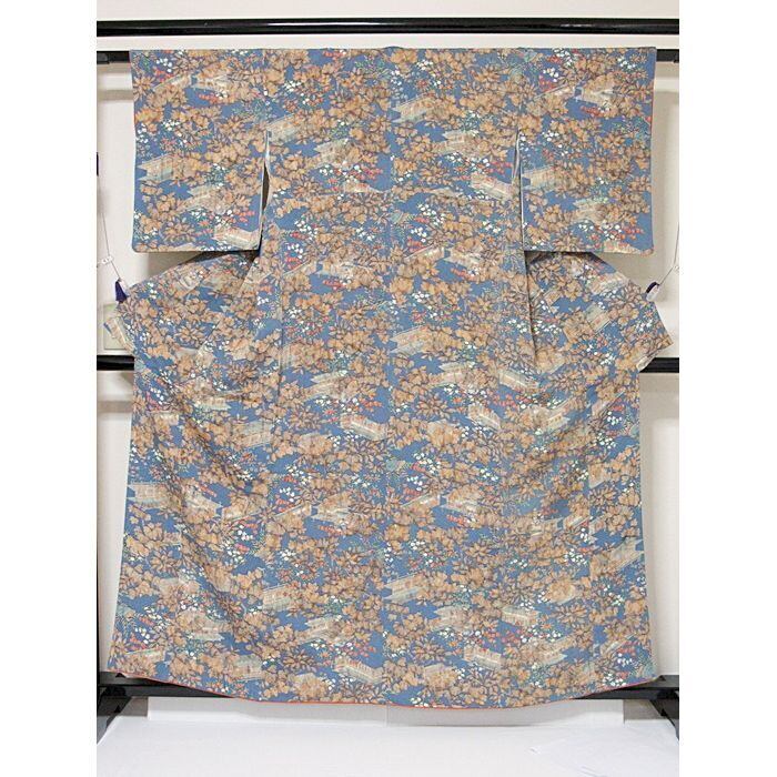 小紋 縮緬 袷 時代風景絵図 淡ブルー 160cm前後