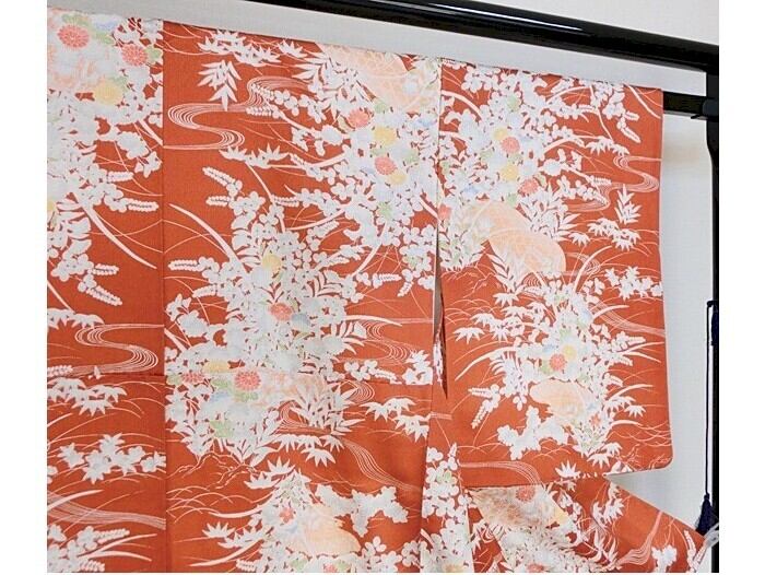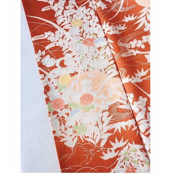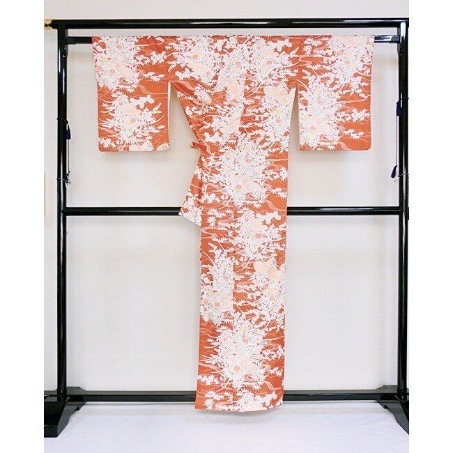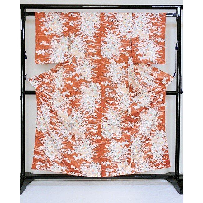未使用 仕付け 小紋 綸子 四季花尽くし 朱茶系 156cm前後