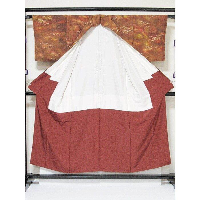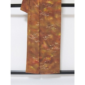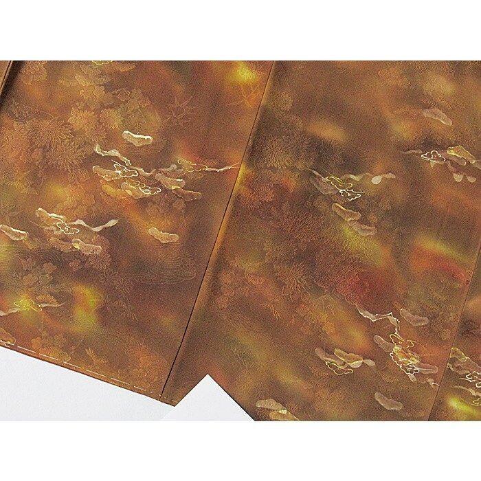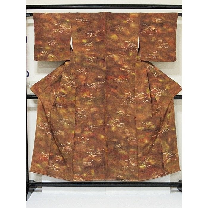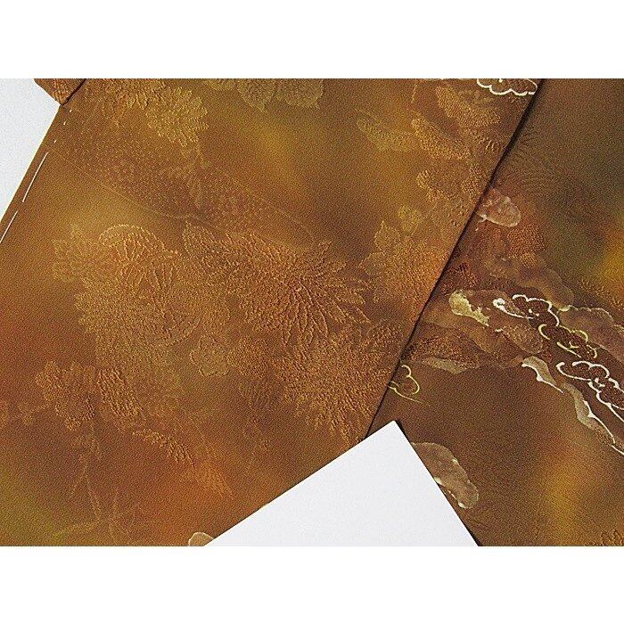 未使用 仕付け 友禅 袷 綸子 地紋お越し 手差し 茶系むら暈し 152cm前後【超美品】お薦めです