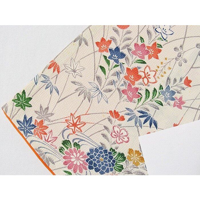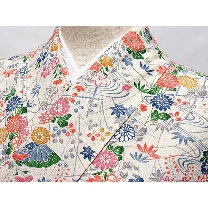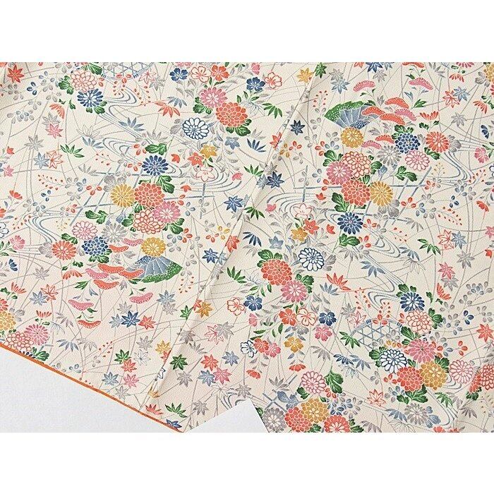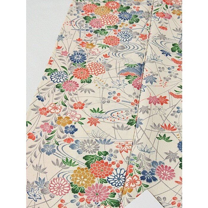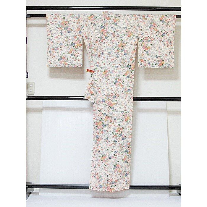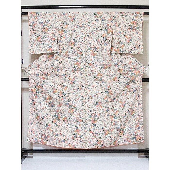 小紋 袷 縮緬 流水 菊秋草 ペールベージュ 154cm前後