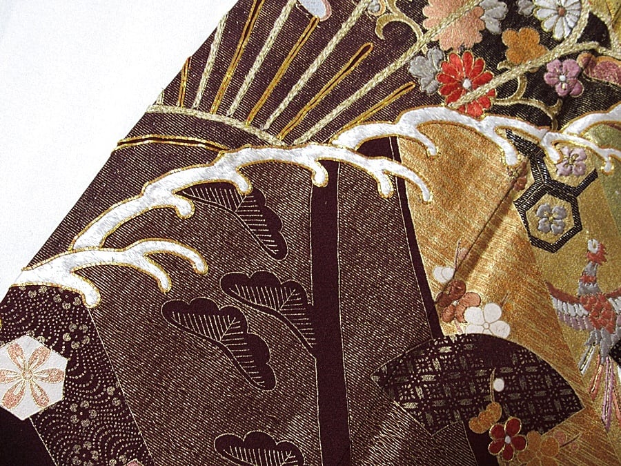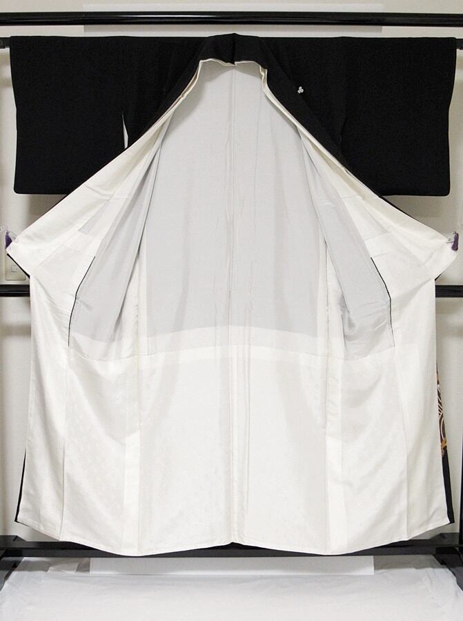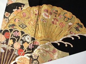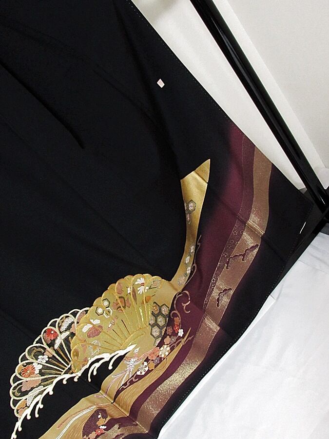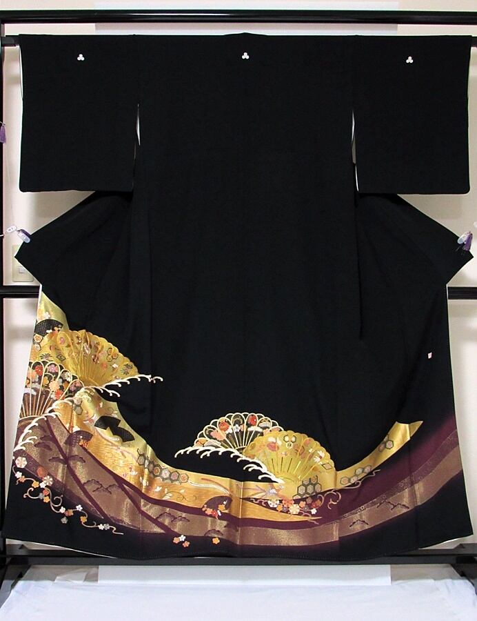 【優品】黒留袖はミセスの第一礼装、格調の高い着物の紹介です。大波に舞菊扇取文が描かれており、金泥、刺繍も豪華に入っております。比翼(正絹)は経年の為薄っすらですが絹特有のモドリ、比翼衿薄っすら筋、比翼(上前)点シミ薄っすら(2mm)確認 着用には問題ない程度。他、表含め大変良い状態できれいですぐに着用できます。