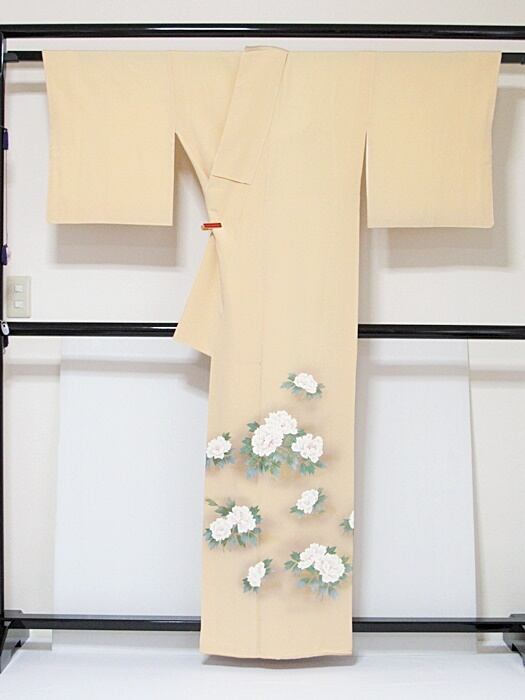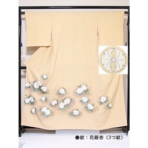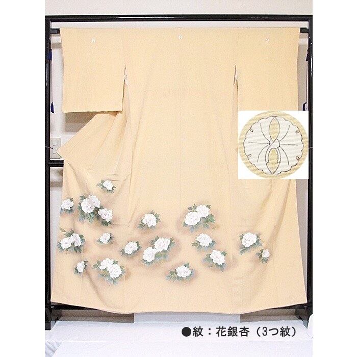 色留袖 未使用 一越 比翼(正絹) 3つ紋 牡丹 薄こむぎ色 160cm前後【超美品】お薦めです