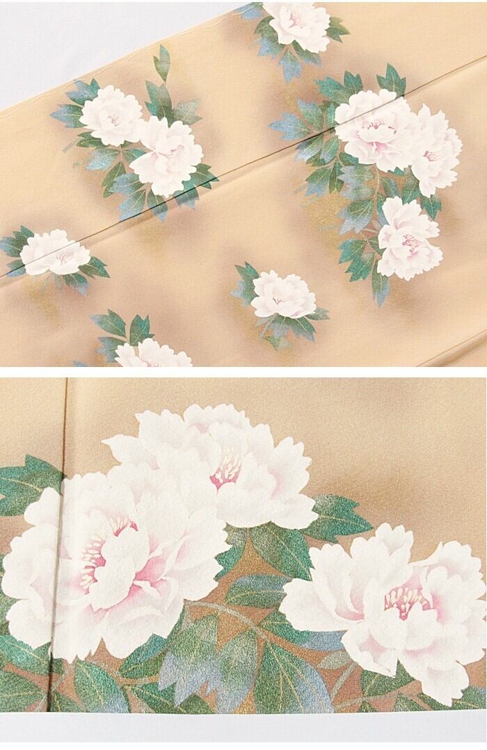 色留袖 未使用 一越 比翼(正絹) 3つ紋 牡丹 薄こむぎ色
