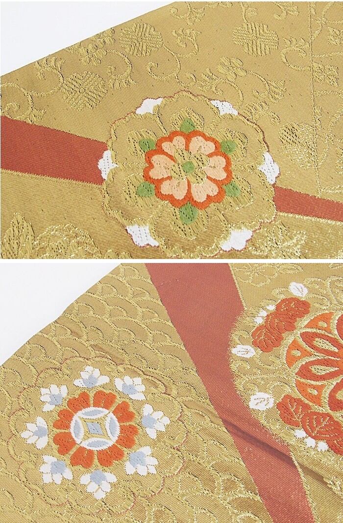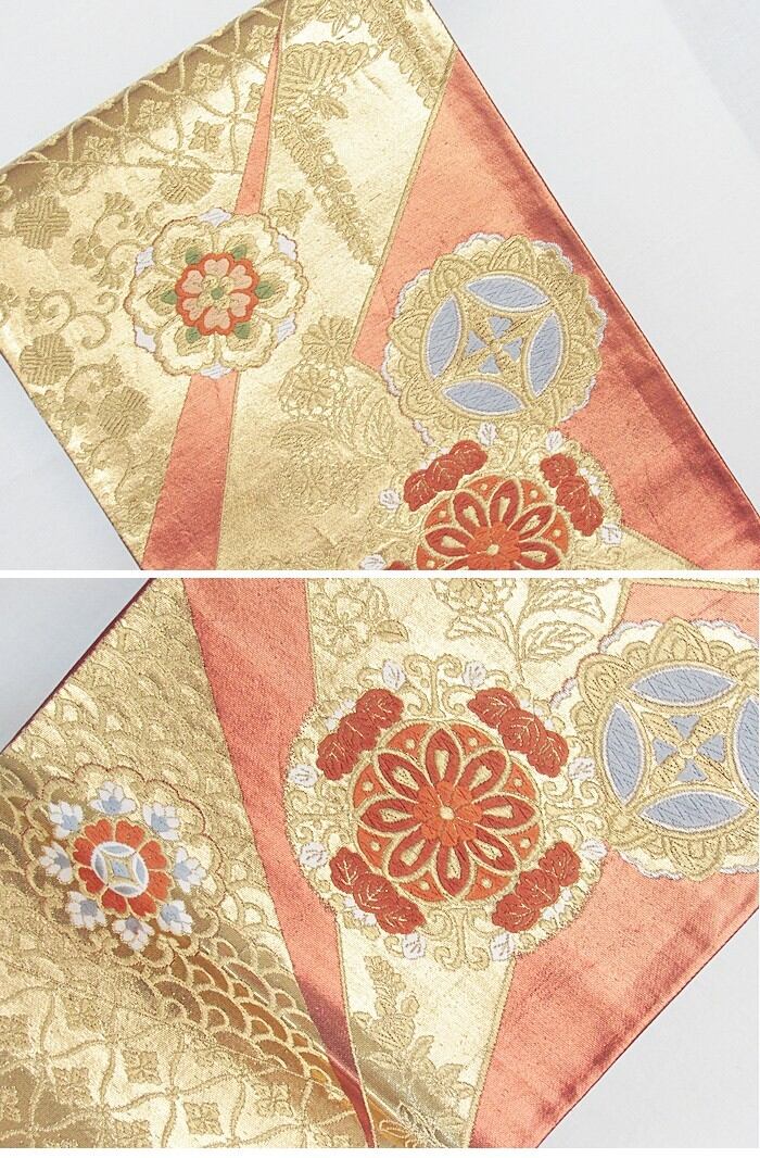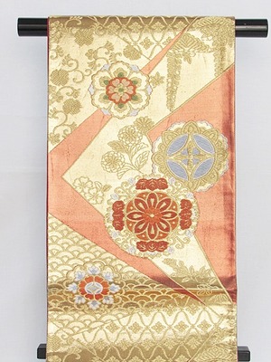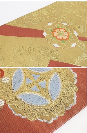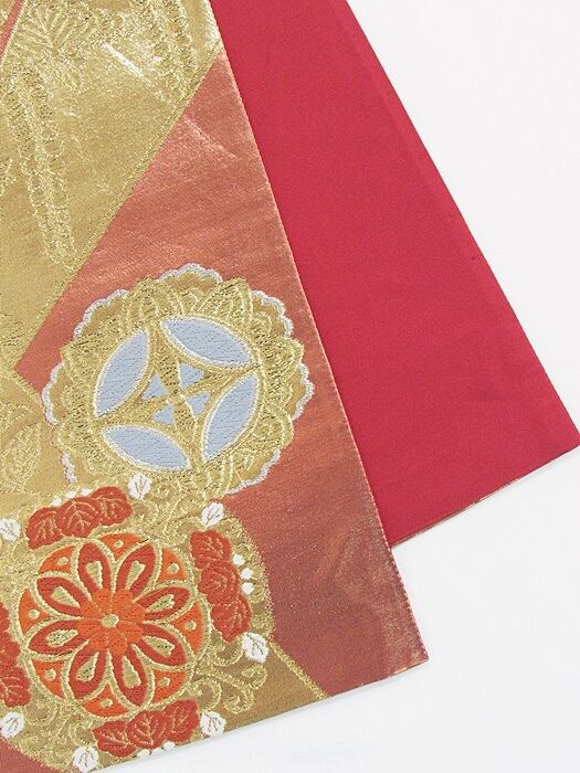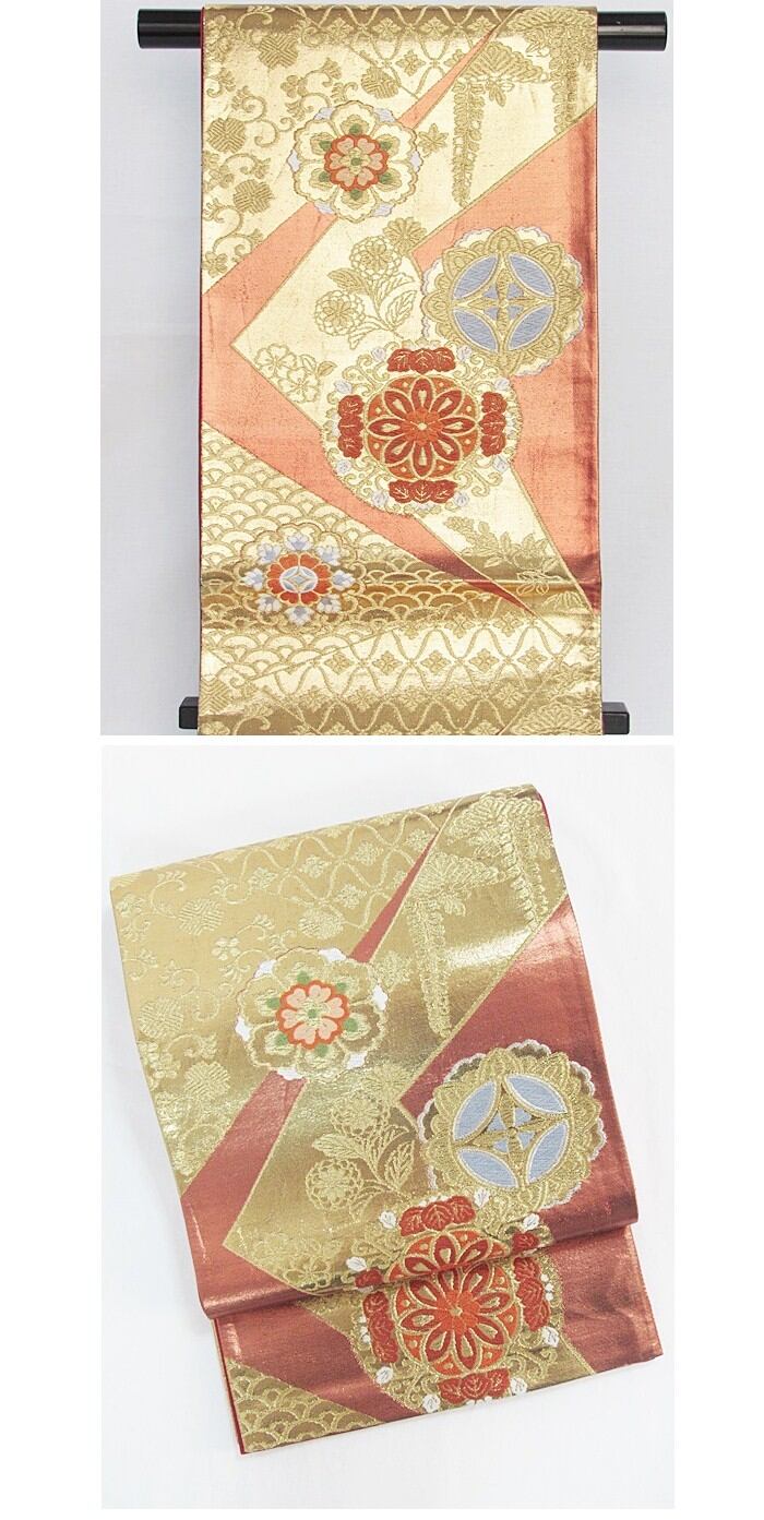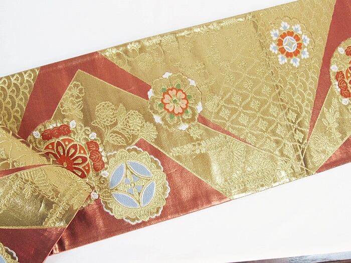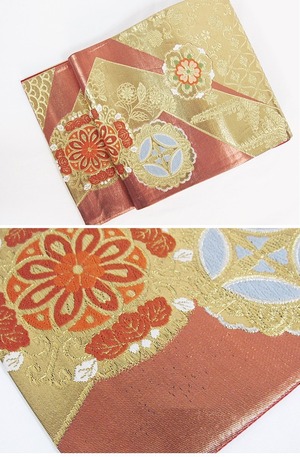 錦袋帯 赤臙脂に金、斜段裂取りに華文柄になります。大変お品の良い