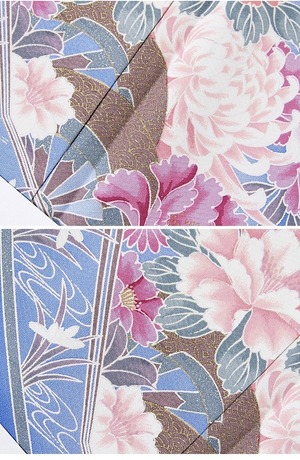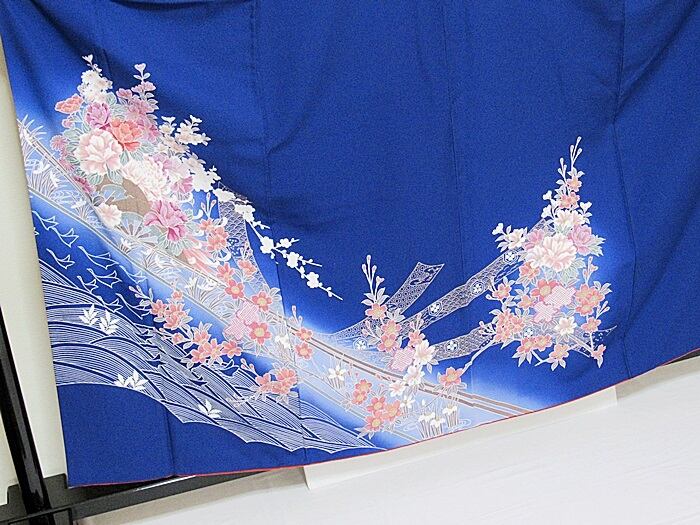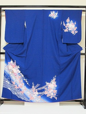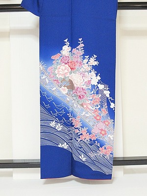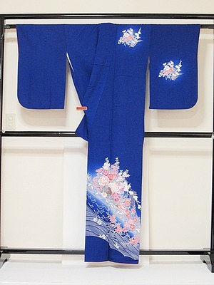 【附下げ】袷着物 綸子/熨斗 波に吉祥花文/160cm前後ベスト★ブルー【美品】