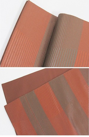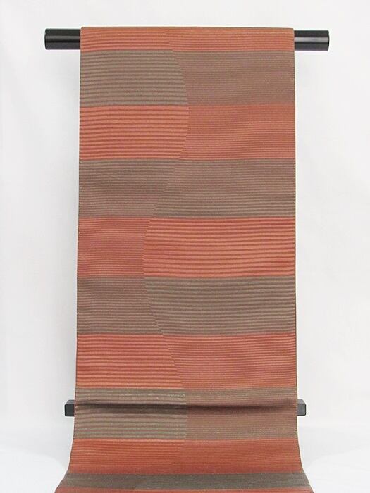 【未使用】【希少 本袋 袋帯】シャレ 赤漆 横段によろけ☆茶地にグリーングレー 赤茶【美品】お薦めです