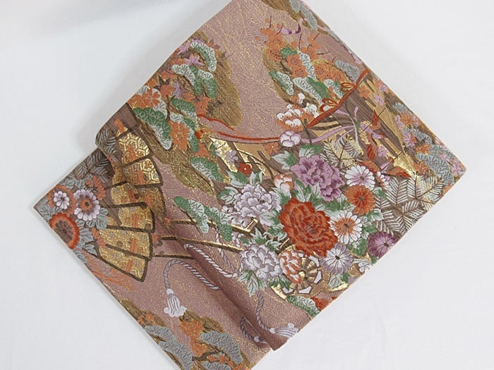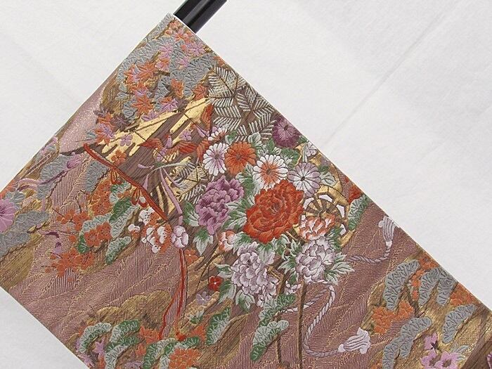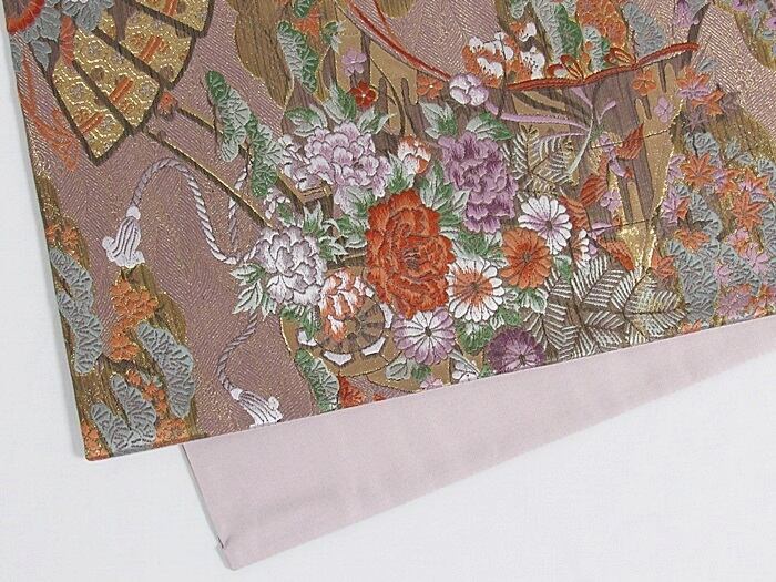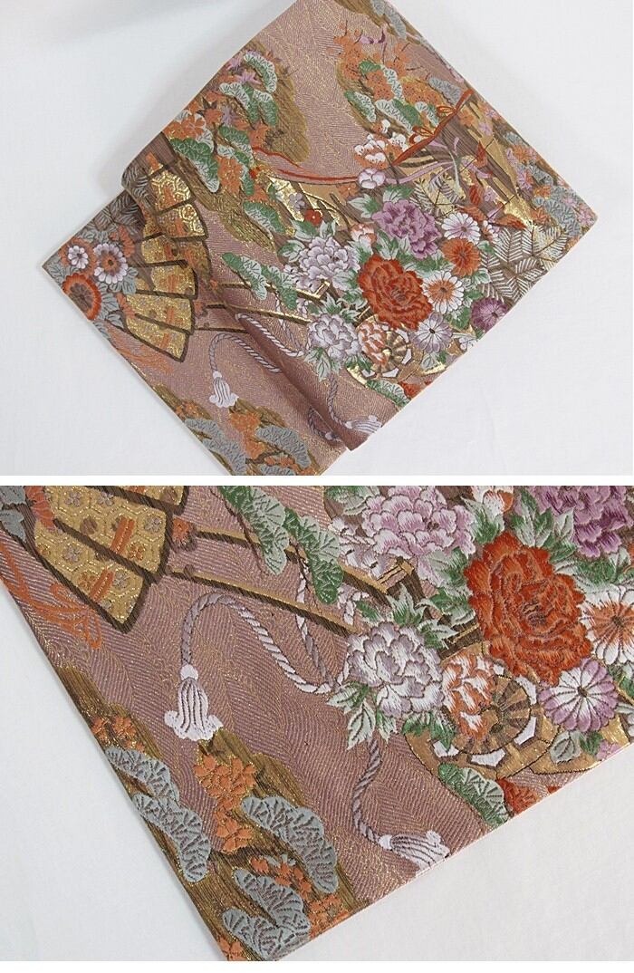 未使用【錦 袋帯】几張に檜扇 花車文/梅ねず 金/大変豪華な帯です【美品】お薦めです