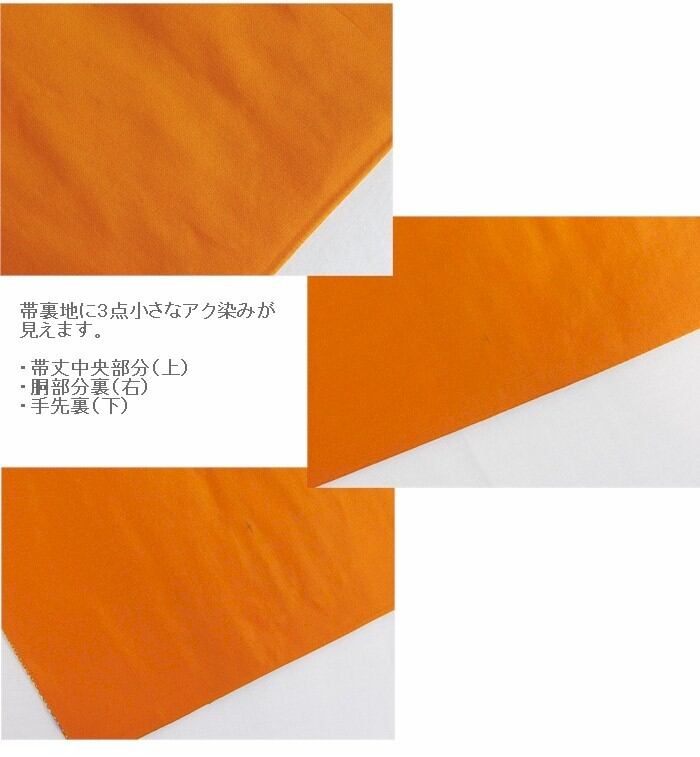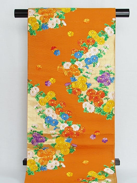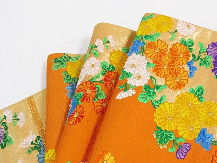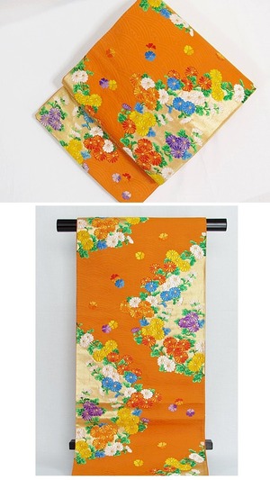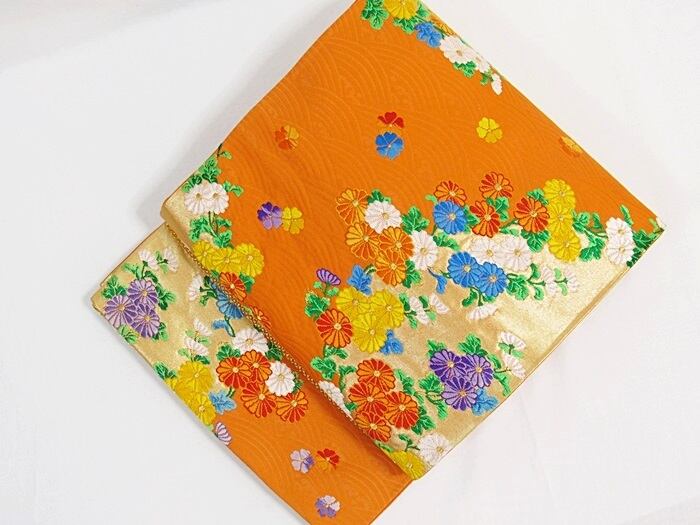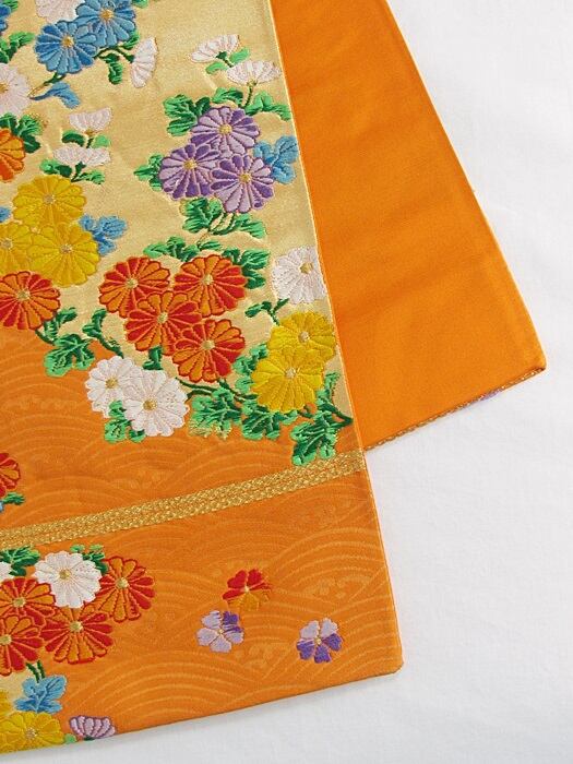 錦 袋帯 リサイクル ジュニア用 波地紋 菊 オレンジ 金
