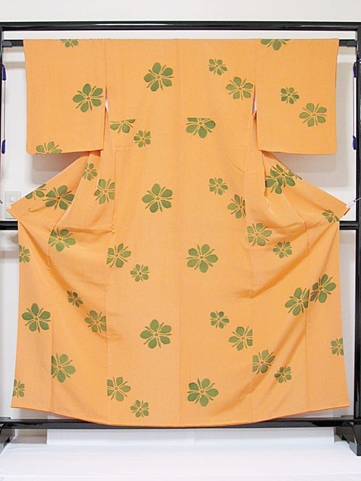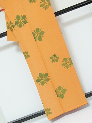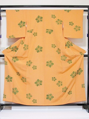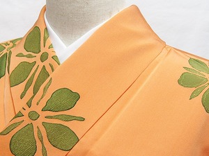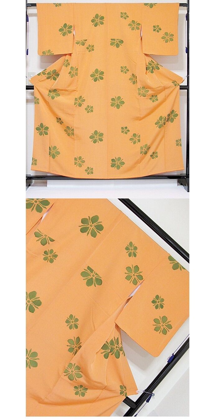 【使用感なし】【小紋】袷着物 紋綸子/花/地紋おこし/オレンジ★159cm前後ベスト【超美品】お薦めです