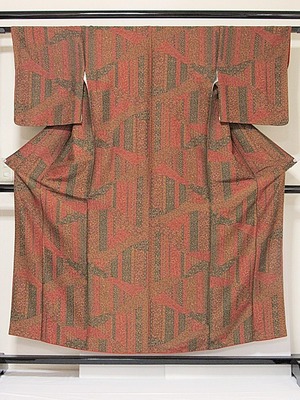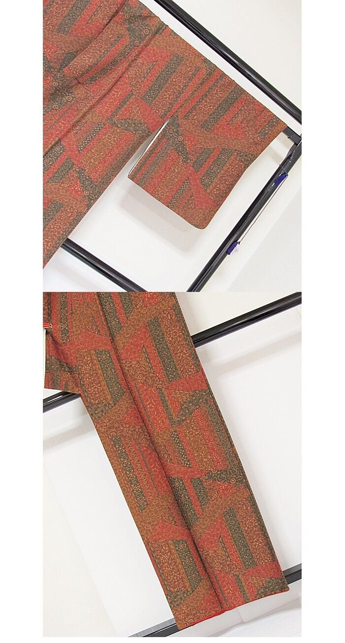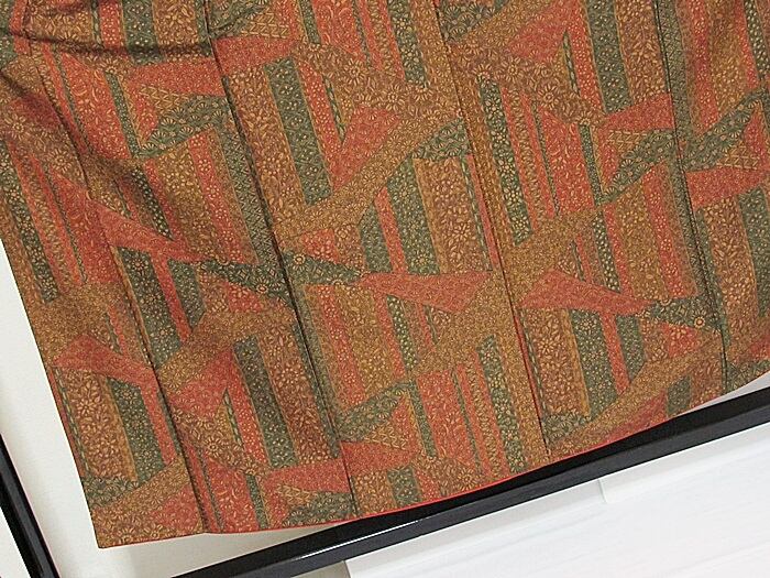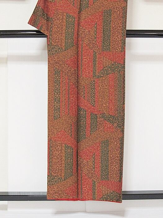 【美品】ブラウン系 グリーン系の裂取り サラサ柄のお着物になります。