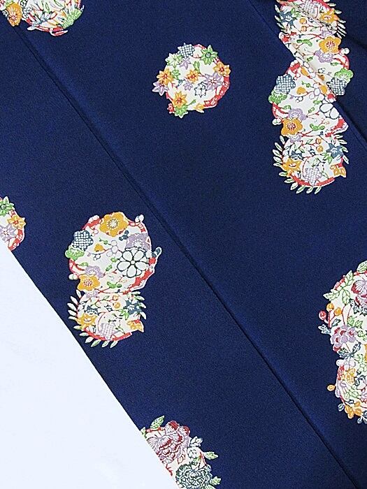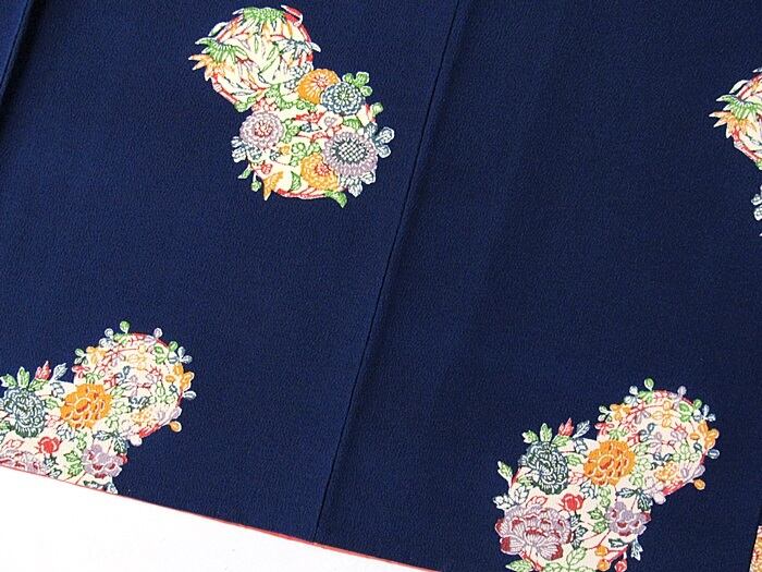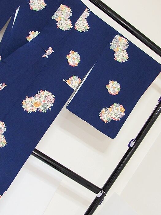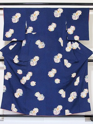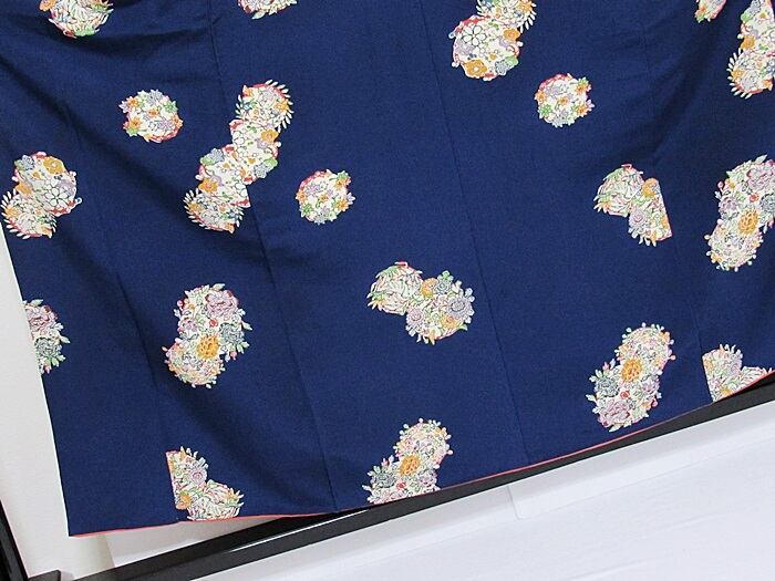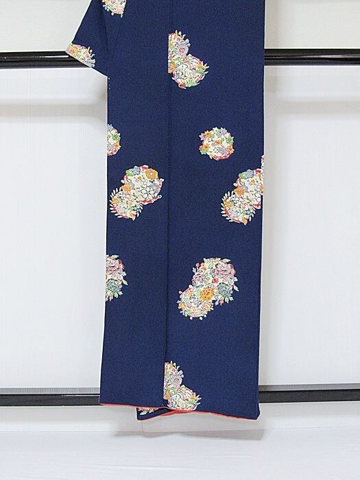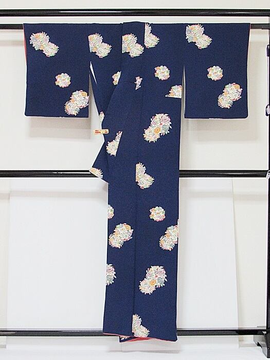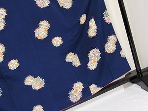 【小紋】袷着物 縮緬 飛び柄 花丸文/156cm前後ベスト★紺【美品】