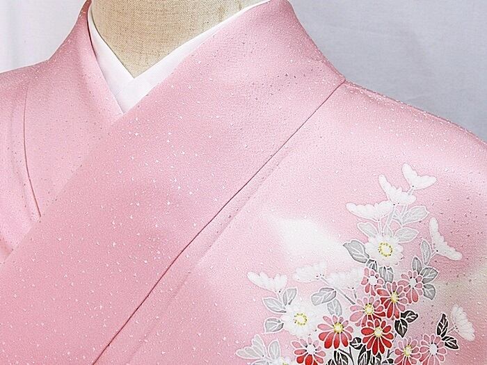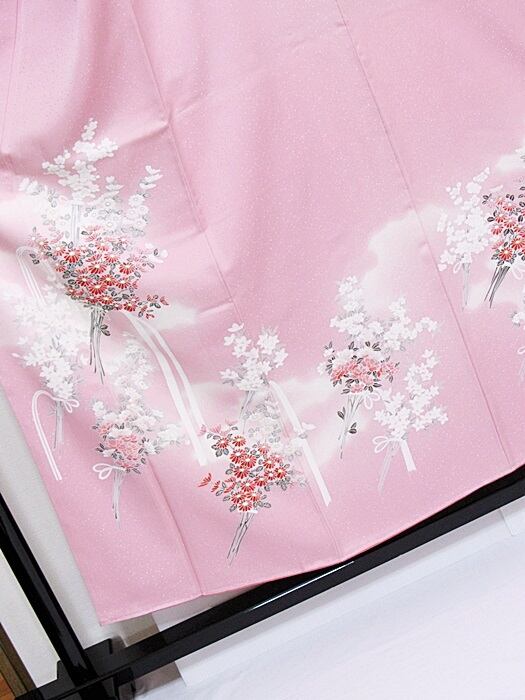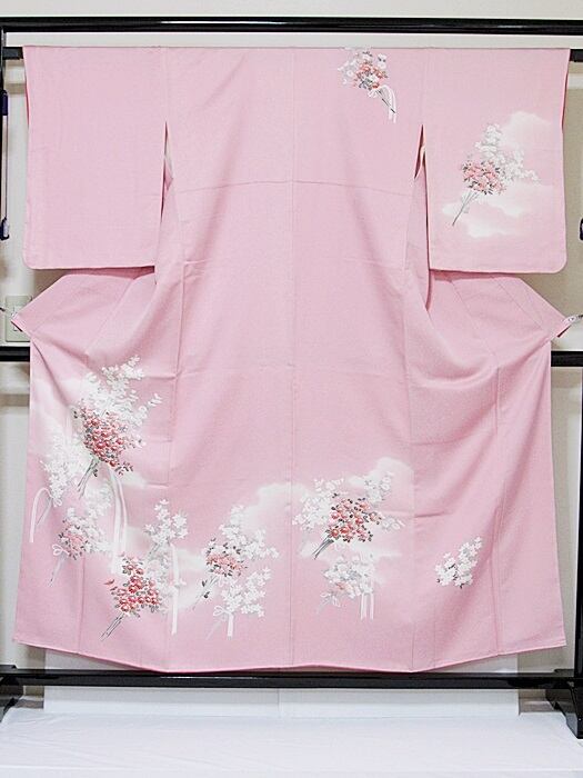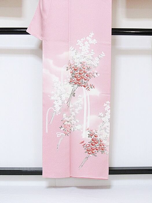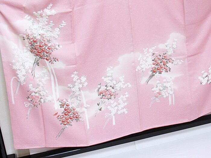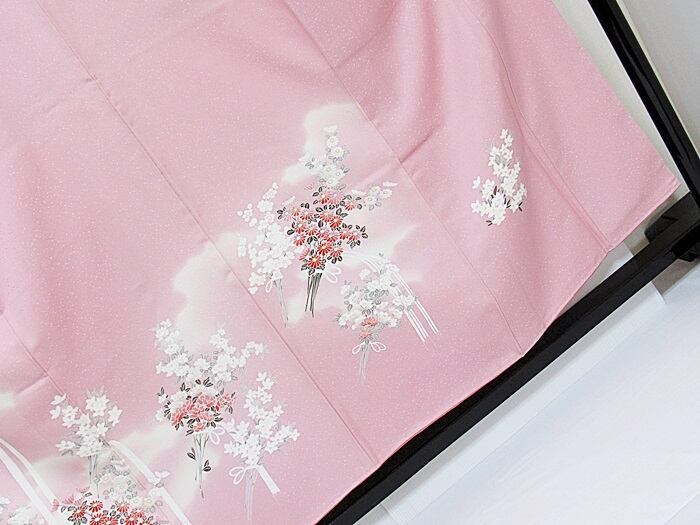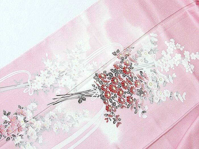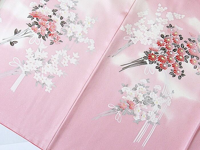 【未使用 仕付け】【附下げ】袷着物 綸子/四季の花束/155cm前後ベスト★ピンク暈かし【超美品】お薦めです