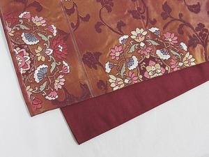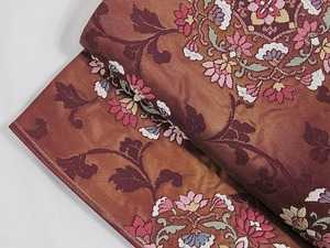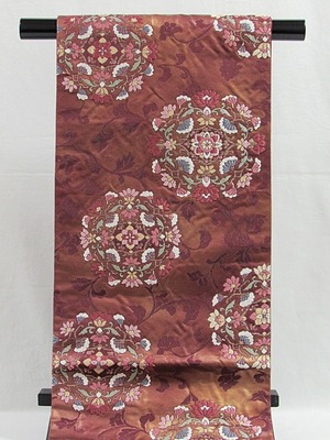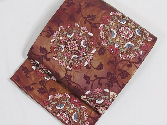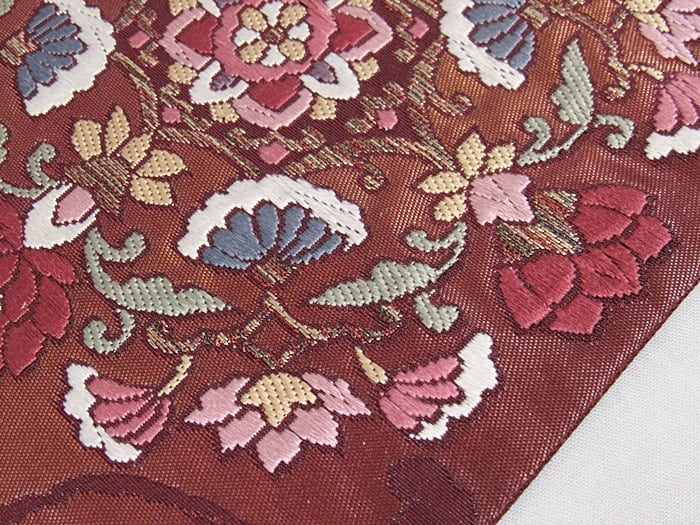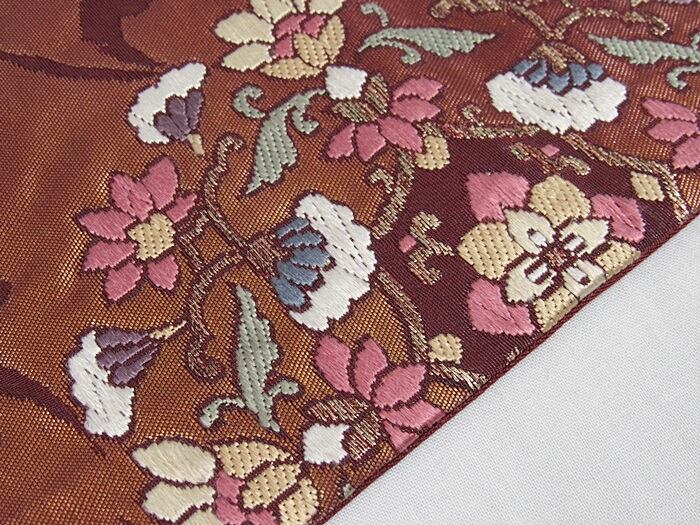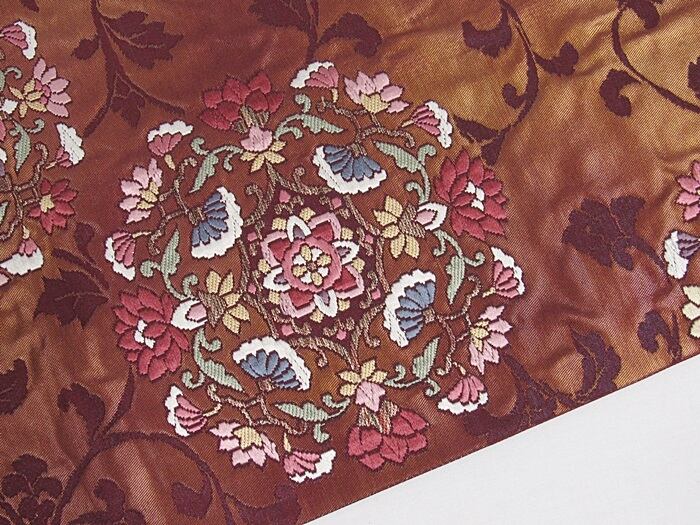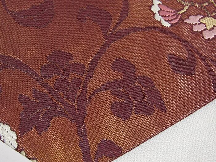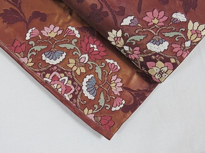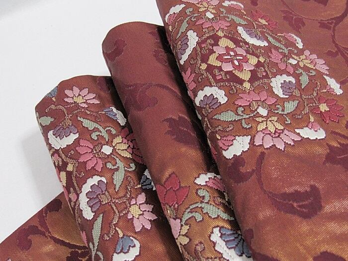 錦 袋帯 唐草 唐花 焼箔 ふくれ織り 臙脂