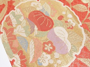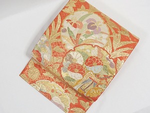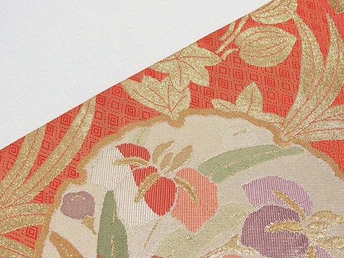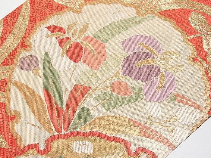 【袋帯】佐賀錦 吉祥花に雪輪 菖蒲 橘 御所車/ピンクオレンジ 金通し【美品】