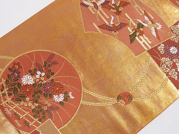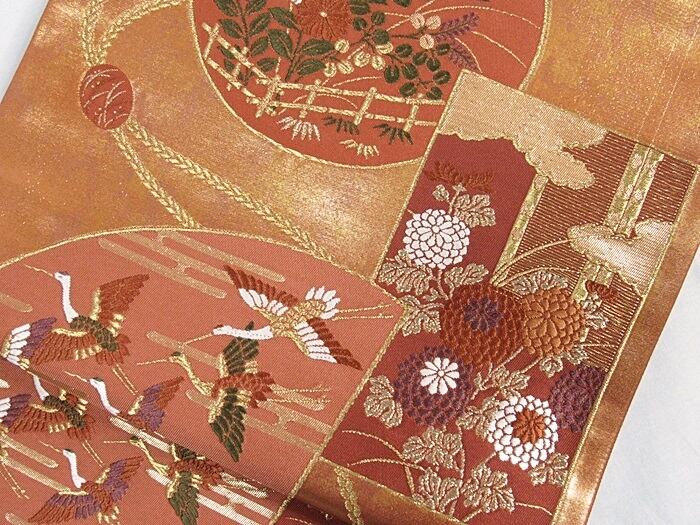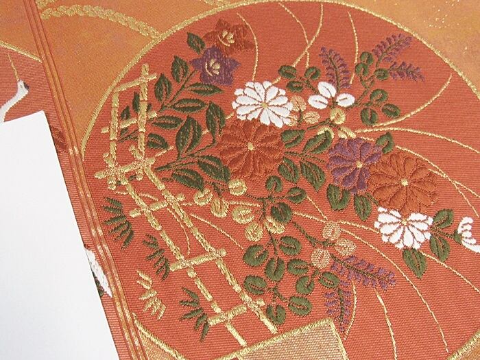 未使用 錦 袋帯 引き箔 紐に円窓 地紙 短冊/朱茶